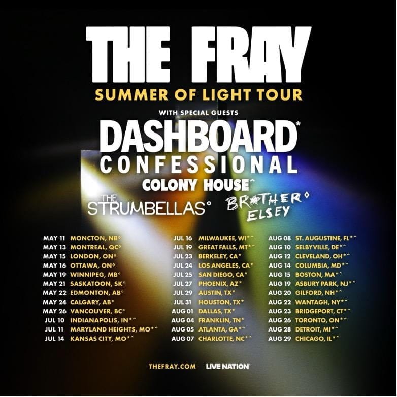 Multi-Platinum band The Fray announces the Summer of Light Tour, featuring special guests Dashboard Confessional, Colony House, The Strumbellas and Brother Elsey on select dates. The North American tour, promoted by Live Nation, kicks off on May 11th in Moncton, New Brunswick, with stops across Canada and the U.S. in Montreal, Calgary, Vancouver, Kansas City, Minnesota, Los Angeles, San Diego, Austin, Atlanta, Boston, and more before wrapping up on August 29th in Chicago, IL.